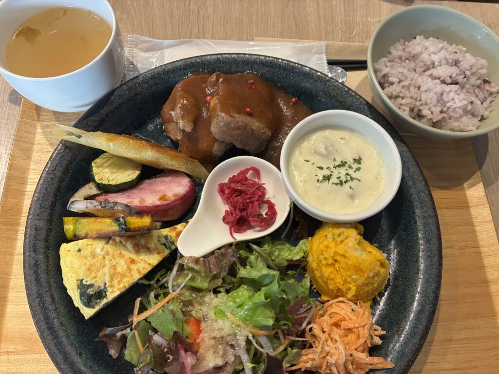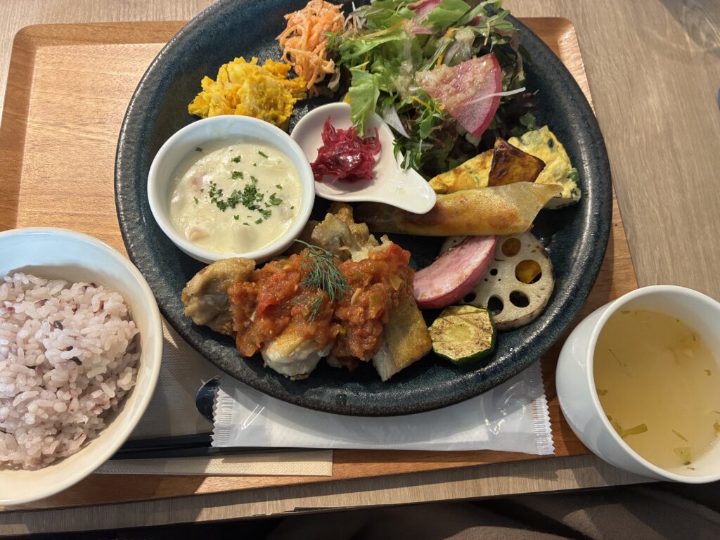 ワンプレートの中にきちんと手の込んだ料理が複数のっています。サラダをのせて終わり、じゃないひとつひとつがおかずでした。ご飯の量も含めて一見量が少ないかなと思いましたが食べ終わってみるとお腹いっぱいで満足度の高いワンプレートランチでした。こういういろんな料理をちょっとずつ食べられるのが大好きです。サンドイッチとデザートも気になるのでまた来たいなという感想でした。