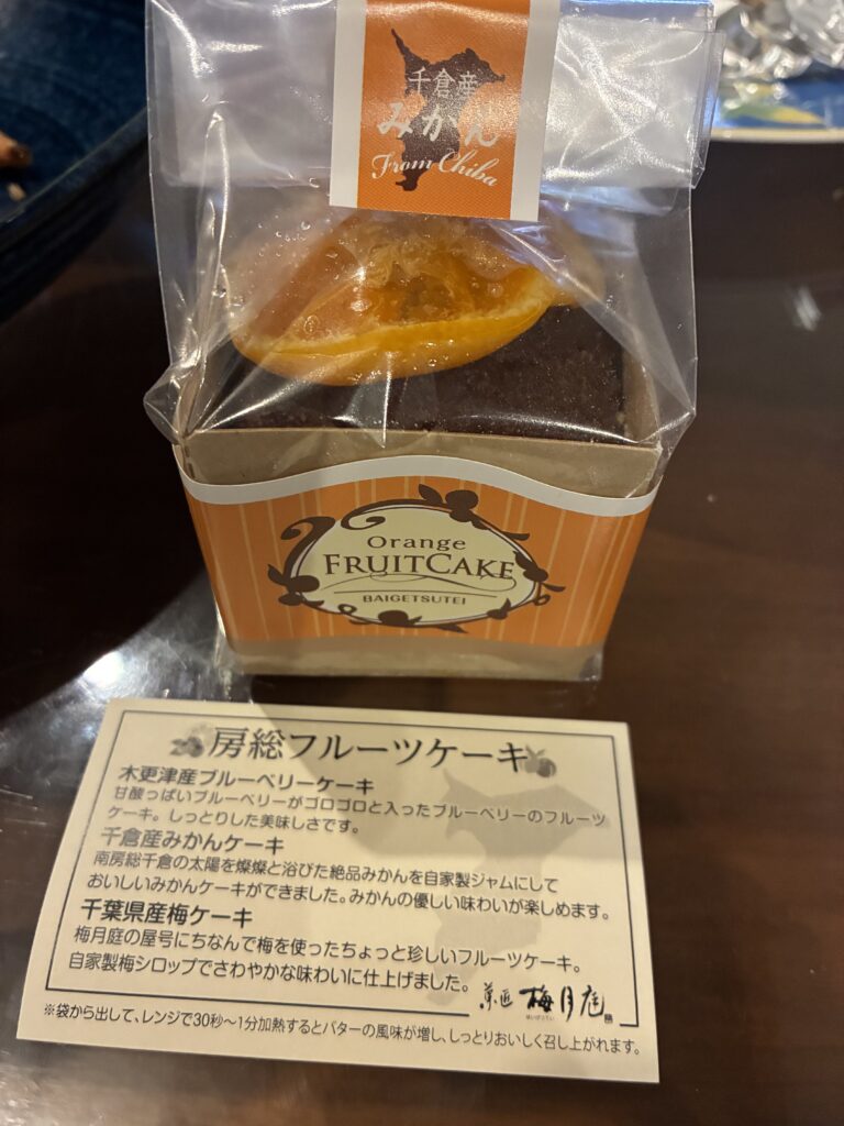 房総フルーツケーキ。木更津産ブルーベリー、南房総千倉産みかん、千葉県産梅をたっぷり使ったフルーツケーキだそうで木更津の菓匠梅月庭という所がだしてるようです。
