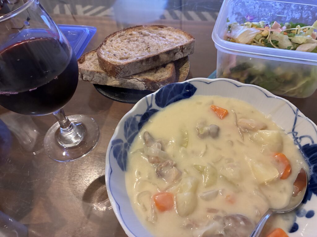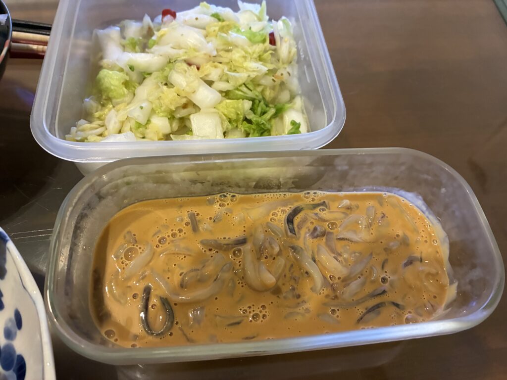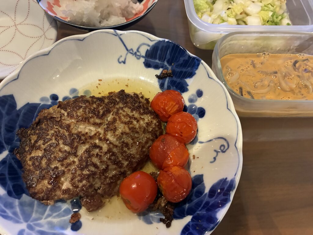 ハンバーグ酒蒸し 白菜浅漬け 塩辛