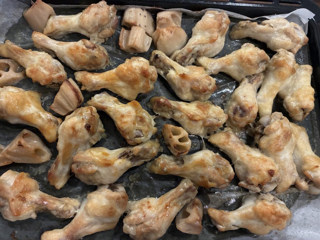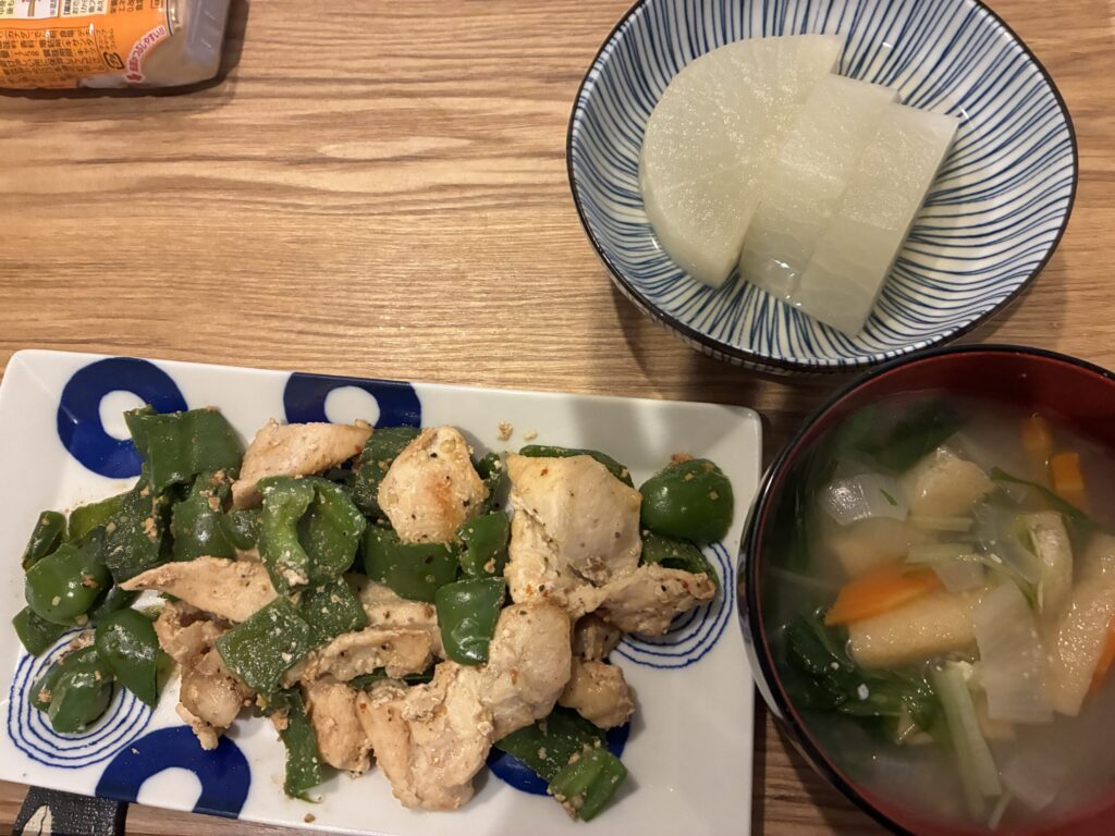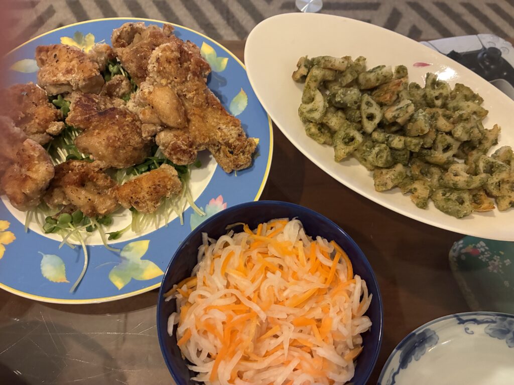 ザクザクレジ横チキン(山本ゆりさんレシピ) 蓮根青のり焼き 柿と大根のなます