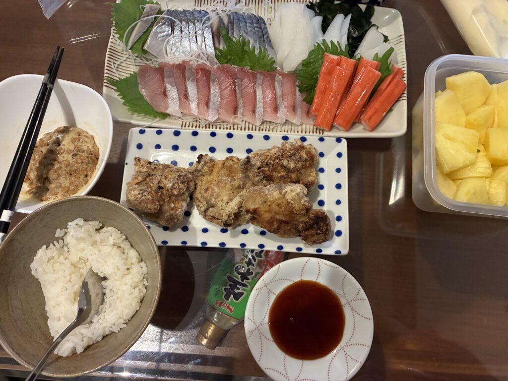 お刺身(ニシン、しめ鯖、イカ) 昨日のチキン パイナップル