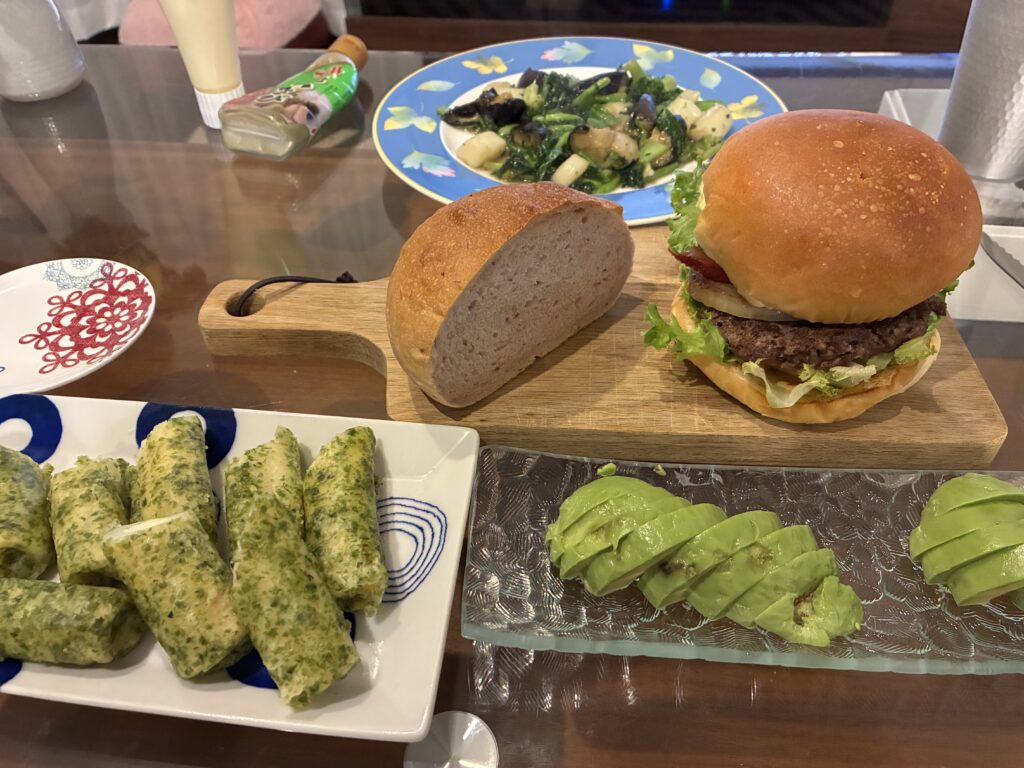 イカと青菜の炒め物 ちくわチーズ 黒いちごカフェのハンバーガー