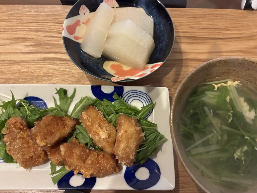 かじきの竜田揚げ 大根煮物 水菜と卵の鶏スープ